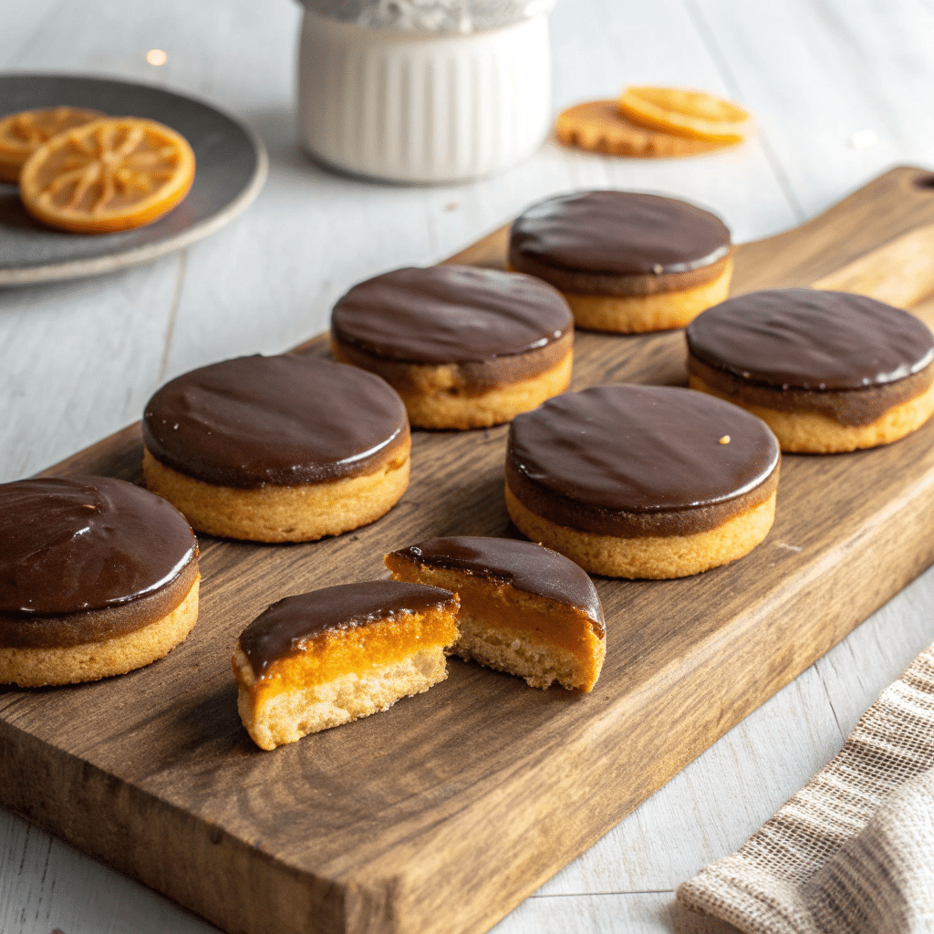Spelt Jaffa Cakes arranged on a rustic wooden board View Gallery 3 photos